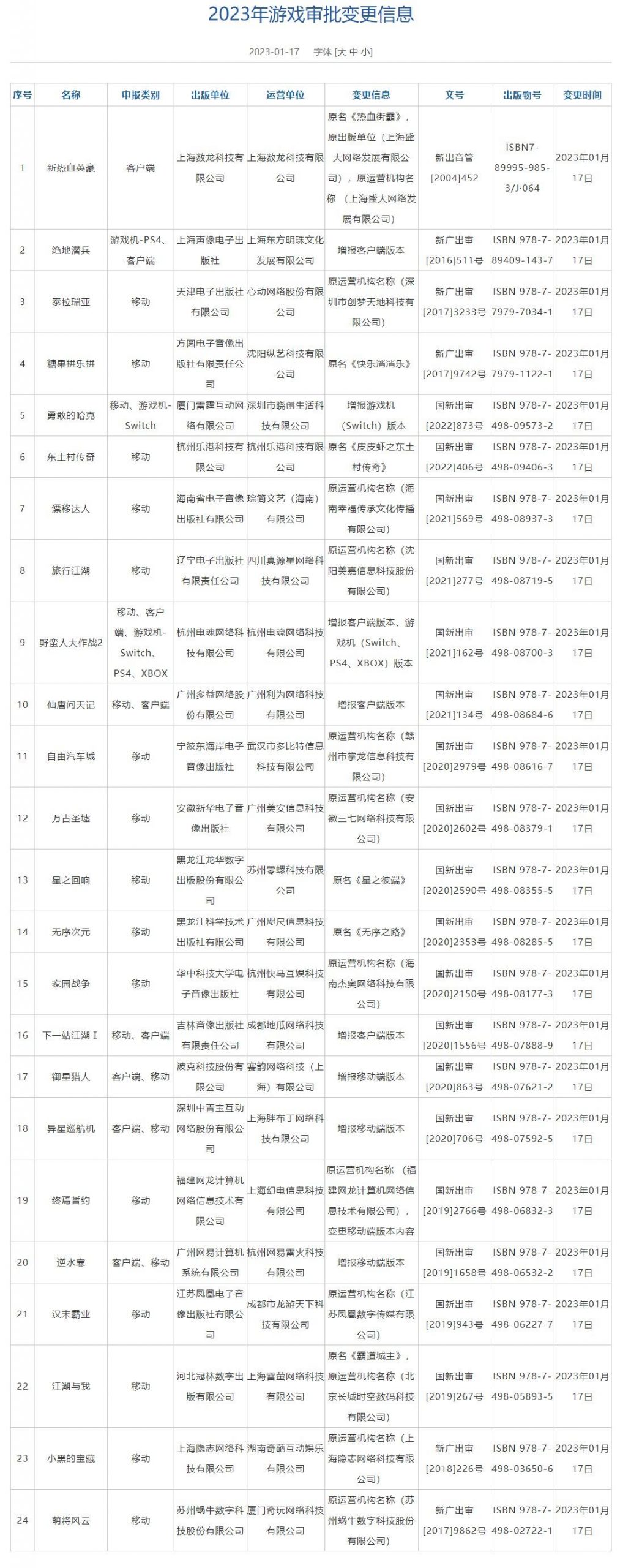 同时公布的还有游戏审批变更信息,有的游戏新增平台,例如《绝地潜兵》增加Pc版本,《勇敢的哈克》增加Switch版本,《逆水寒》增加手机版本。