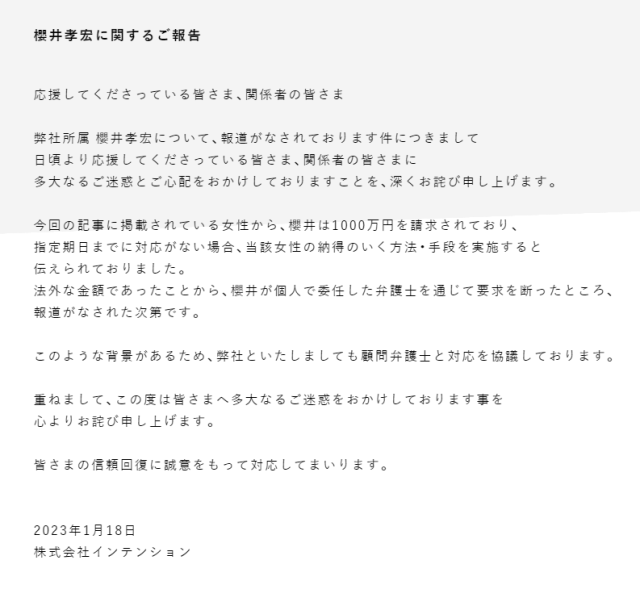 而在今日(1月18日),樱井孝宏的事务所 INTENTION也回应,由于在报导之前,B子提及希望得到赔偿金1000万日元,且如果没有在指定日期内做任何回复,将会有大动作。而樱井孝宏所委托的律师,以费用太高为理由拒绝赔偿要求后,B子便在《周刊文春》公开爆料,目前事务所也在与专业律师进行应对。