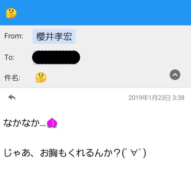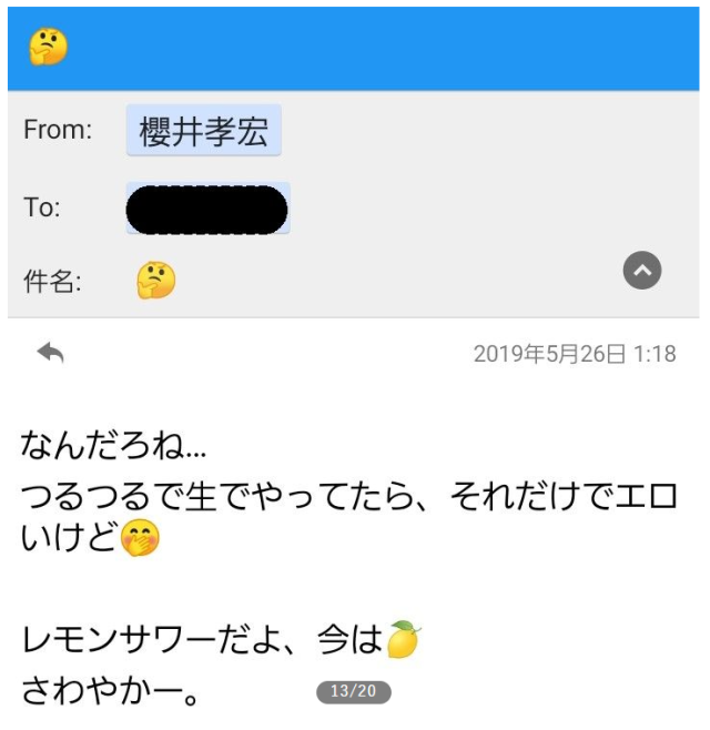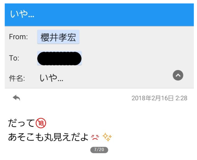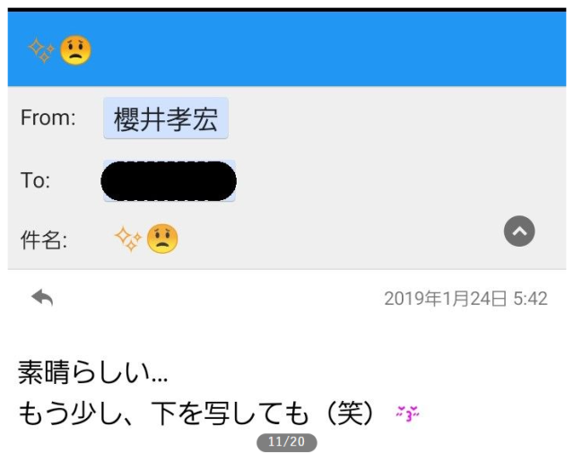 报导还指出,虽然在2009年时,当中B子也几度怀疑,樱井似乎与自己以外的女性有着交往关系,进而选择与对方保持距离。虽然在6年后,B子与樱井孝宏复合时,收到了他赠送的一枚戒指,但也从复合后,樱井对于B子的态度开始不如以往,甚至还一度要求女方拍摄胸部、私密处、屁股等私密裸照的淫秽行为,这让B子开始对自己自我怀疑,是否只是成为了樱井的性欲发洩出口,导致B子因此陷入失眠、大量掉发等现象,并且向心理医师协助。