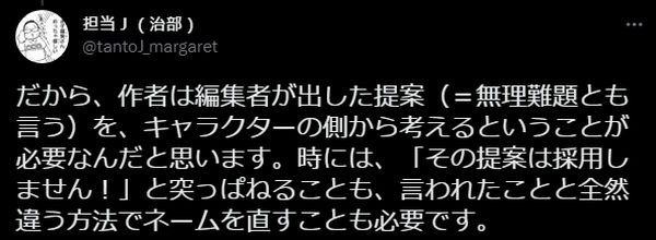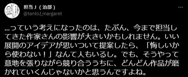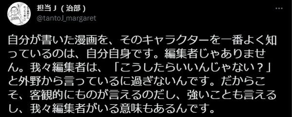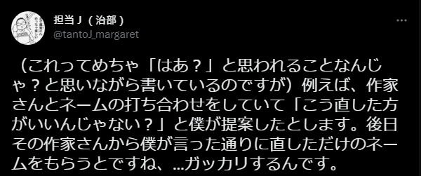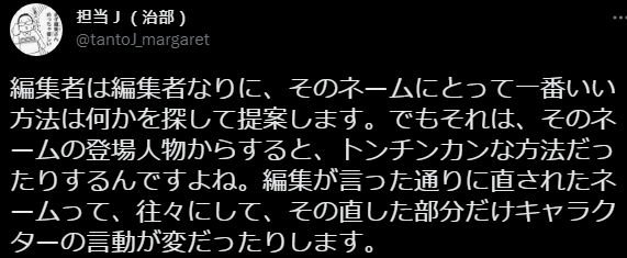 日本集英社的漫画杂志《玛格丽特》(マーガレット)担任编辑治部智宏近日发推文指与漫画家讨论草稿的时候,一旦他提议:「这边这样改是不是比较好?」过了几天后漫画家拿了改过的草稿来,完全照着他当时说的改就会感到失望。