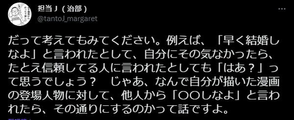 他以「结婚」为例子,指「假设你被别人说:『快点结婚好不好?』但是你根本没有结婚的意思,即便你很信赖那个人,也会觉得莫名其妙吧?那为什么有漫画家对于自己创作的漫画,被别人说『这边应该怎样怎样』,就会一五一十照做呢?」