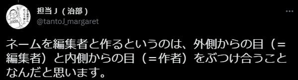 治部编辑觉得与编辑一起修正草稿这件事,编辑担任的是来自外侧的视角,漫画家则是来自内侧的视角,两者会在过程当中是会相互碰撞。