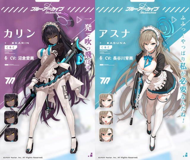 《蔚蓝档案》中的人气角色「一之濑明日奈」,是千禧年科学学园的二年级生,同时还身兼秘密组织 C&C 的特工,执行任务时会换上兔女郎装扮,展现夸张的好身材。而「角楯花凛」与明日奈同为秘密组织 C&C 成员,和看似凶恶的外表不同,在C&C特务当中就属她的个性最为谨慎,以釉黑的皮肤搭配好身材也在玩家中颇具人气。
