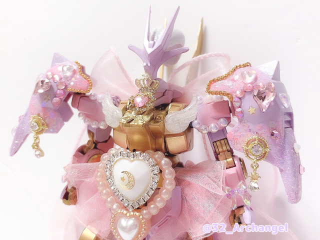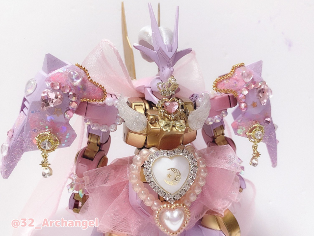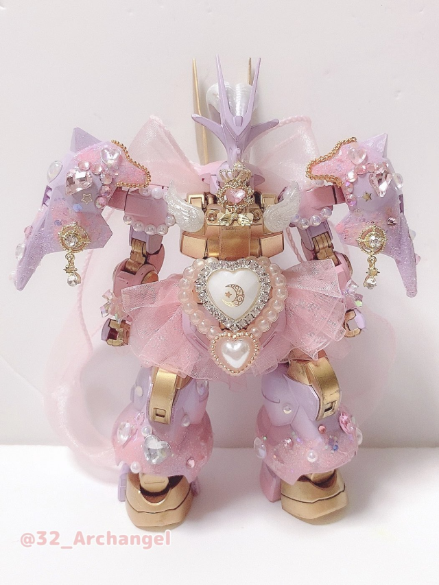 这次挑战她是先制作古尔的迪兰萨专用机,以粉紫色搭配粉红色与金色的色调涂装,搭配少女风满满的装饰与水钻珍珠等等,整个看起来…这台迪兰萨要出嫁了是吗 ( ? )