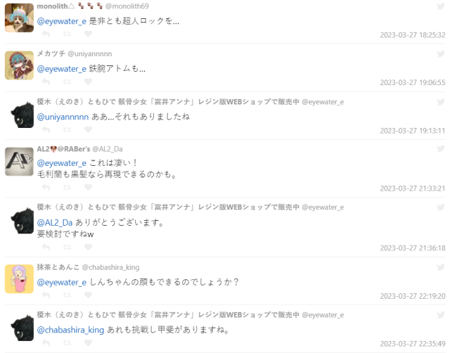 榎木之もひで挑战了被网友喻为不可能的创作后,也有网友敲碗希望他能做做看《超人洛克》 ( 超人ロック ) 、《原子小金刚》、《名侦探柯南》毛利兰的头发这类角色发型较为特别的角色,甚至《蜡笔小新 》 野原新之助的脸也有人建议可以尝试 XD。