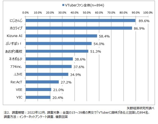 整份调查研究共有199页,在矢野经济研究所的官方网站以日币15万圆的价格出售。像这样的商用市场调查,想必内容会有一定的可信度,调查方法应该也能顾及效度才对。而认知度在前三名后面的是「VSPO(ぶいすぽっ!)」54.0%,以及「あおぎり高校」51.3% 。